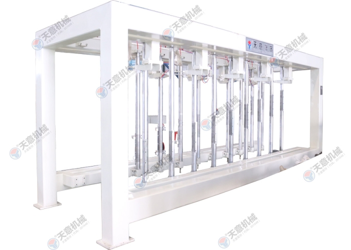 脫模后的坯體連同側板一起放置在切割小車上,切割小車由減速電機驅動行走,通過縱向切割機完成縱向切割,切割小車繼續行走至橫向 切割機中間位置停止后,由小車置換裝置將側板連同坯體抬起,切割小車退回翻轉行車底下進行下一次承載脫模后的坯體,另外一部切割小車 進入置換裝置底下后, 置換裝置將側板連同坯體放置該切割小車上后,橫向切割動作后啟動進行橫向切割動作,切割完成后,切割小車再行走至確地行車底下,再由 翻轉去底行車將坯體去底(連側板)吊至蒸養小車上,切割小車范圍原始位置進行下一個切割循環。