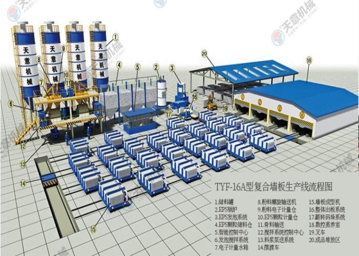 TYF-16A型復合墻板生產線是天意機械公司綜合國內外技術經驗,開發研制的新型墻體板材生產線。復合墻板生產線主要分為配料系統、攪拌系統、發泡系統、數控配電系統、墻板成型系統、料漿泵送系統、EPS預發系統、液壓循環系統、整體出板系統。